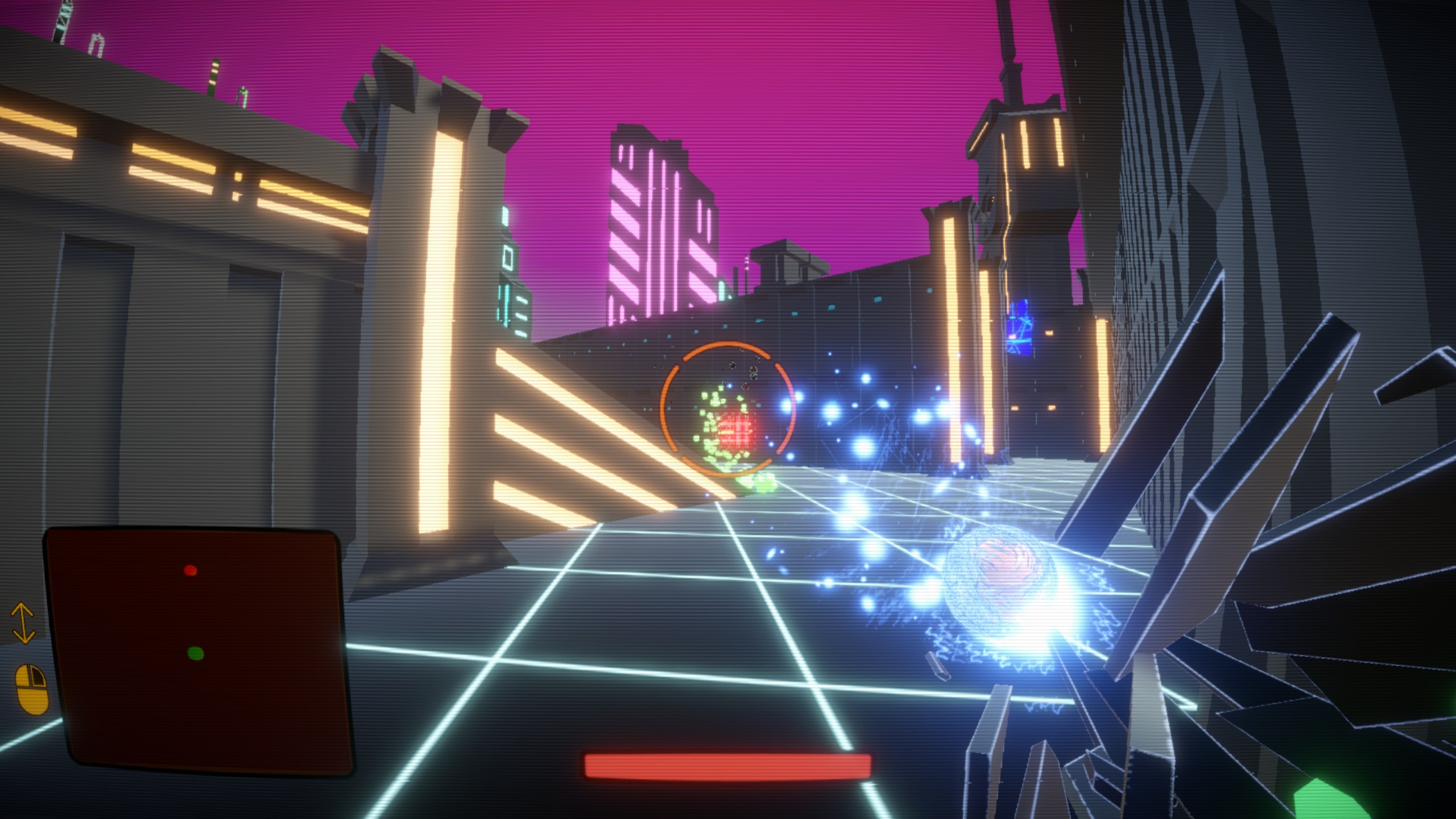 Split between two worlds, a cyber-dystopian system overrun by AI corruption, players must survive as long as possible while traversing procedurally generated rooms. The further they go, the more difficult enemies become, evolving with increased corruption. The gameβs aesthetic features abstract digital enemies—floating cubes, triangles, and glitch effects—immersing players in an ever-changing virtual battleground.